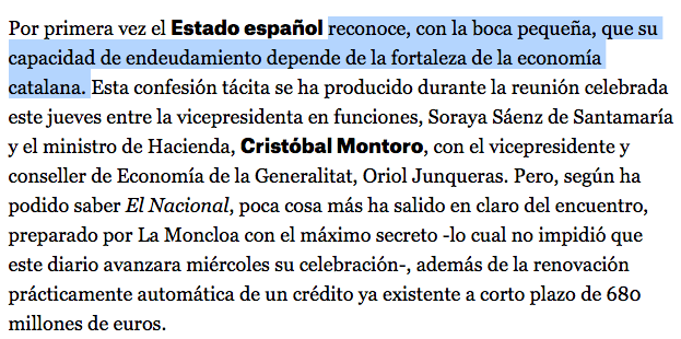 2) España también necesita de los números de Cataluña, y lo pasaran jodido. Oyendo a los españoles parecería razonable que dejaran que Cataluña se largará si el escenario futuro para los territorios de Madrid es tan halagüeño sin la "lacra" catalana. Es curioso que desde los Madriles solo salen exministros Borrell poniendo escenarios funestos para Cataluña pero nunca oigo un mesetario o botifler hablando de cuál es él escenario para los remanentes del imperio (¿para bien, para mal...?).
